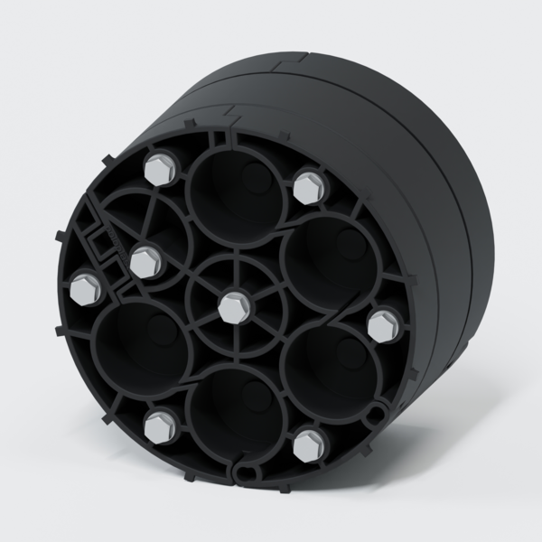 aufklappbarer Kunststoffquetschflansch mit Verpressindikatoren, für die Aufnahme bereits eingezogener Leitungen, dicht gegen Sickerwasser bzw. drückendes Wasser bis 10 m Wassersäule.