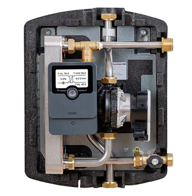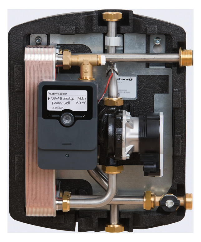 Elektronisch geregelte Frischwasserstation mit vielen Optionen wie Zirkulationsprogrammen, Kaskadenfunktion für bis zu 4 Stationen und Hygieneprogrammen.