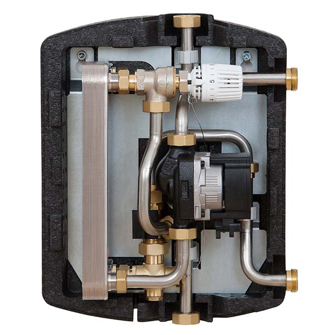 Funktionelle und kompakte Frischwasserstation mit guter Regelgüte durch das Zusammenspiel der Pumpenlogik und dem Regelventil mit schnellem thermischen Stellantrieb. Die Vorwahl des WW-Temperaturbereichs erfolgt durch einen Thermostatkopf.