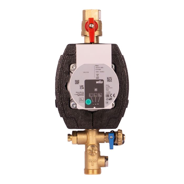 Zirkulations-Set mit Zirkulationspumpe, Absperrkugelhahn, Spülarmatur, Schwerkraftbremse und Tauchhülse inkl. Temperaturfühler PT 1000