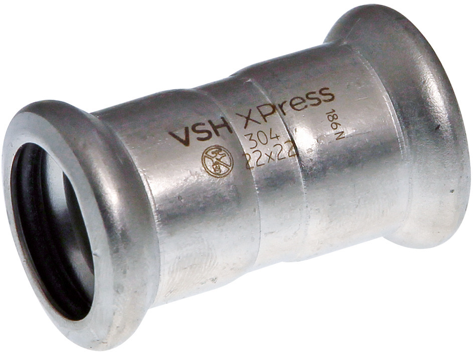 Die VSH XPress Muffe R2401 ist ein gerader Verbinder aus Edelstahl mit zwei Pressanschlüssen.