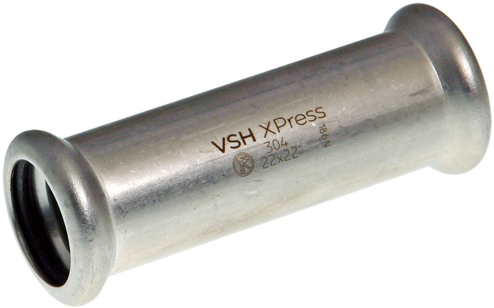 Die VSH XPress Schiebemuffe R2403 ist ein gerader Verbinder aus Edelstahl mit zwei Pressanschlüssen.