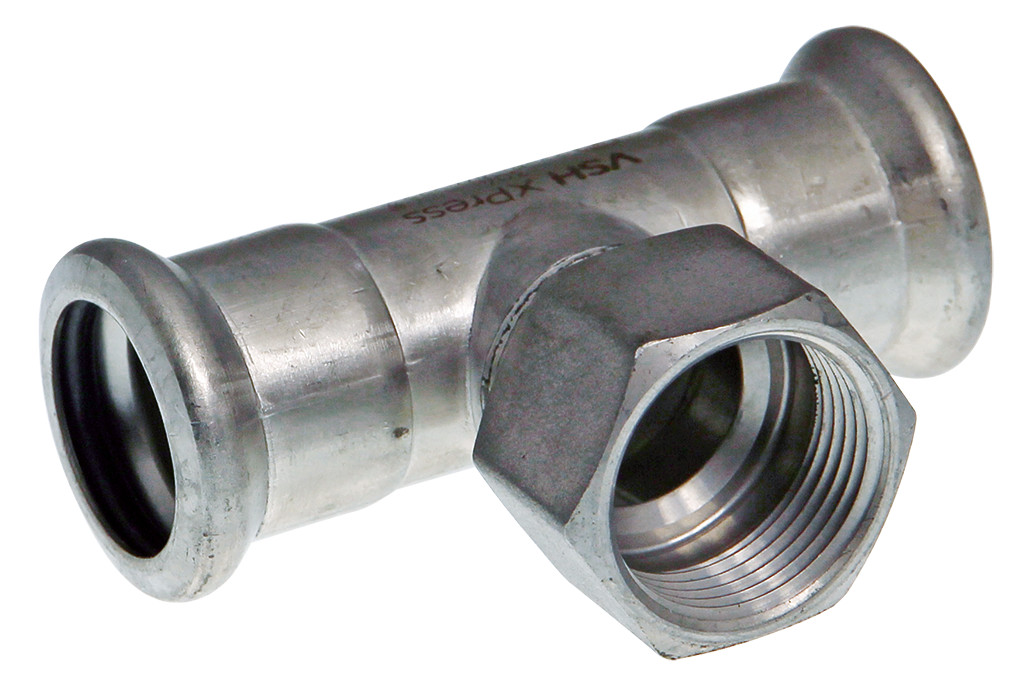 Bei VSH XPress R2414 handelt es sich um ein T-Stück aus Edelstahl mit drei Innen Gewinne Pressanschlüssen