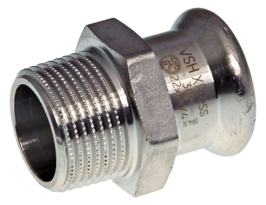 Das VSH XPress Übergangsstück R2705 ist ein gerader Verbinder aus Edelstahl mit einer Pressanschlüss und einem Außengewinde.
