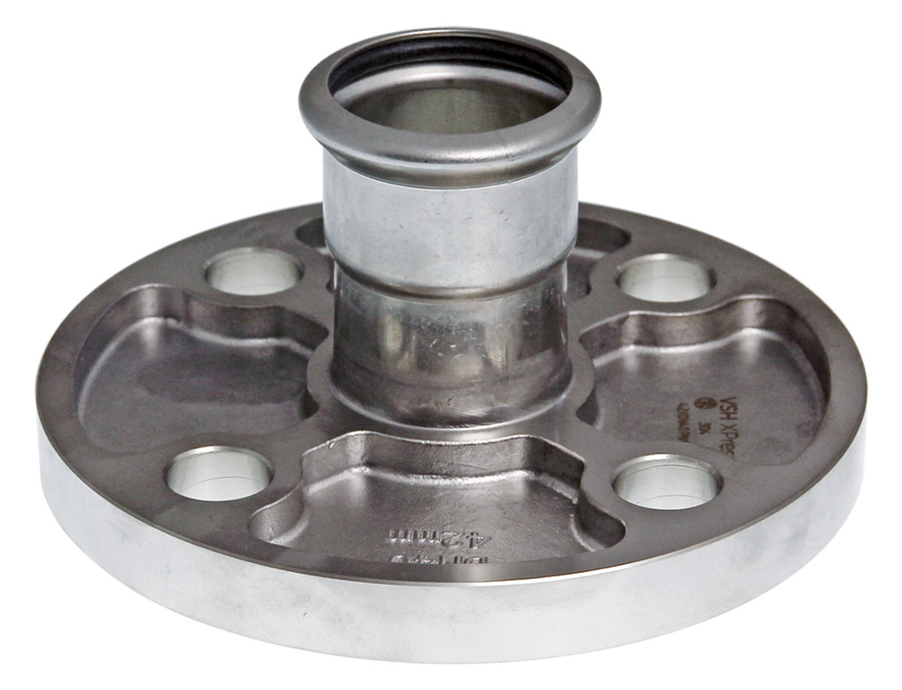 VSH XPress R2426 ist ein Übergangsflansch PN10/16 aus Edelstahl mit einer Pressanschlüss und einem DIN-Flanschanschluss.